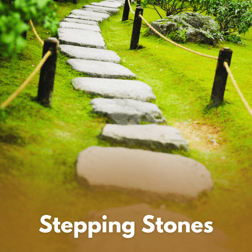 The "Stepping Stones" in the image symbolize the careful and deliberate steps we take in life's journey. They guide us forward, one step at a time, through a lush, serene environment. Each stone represents progress, balance, and the importance of mindful decision-making. The path reflects a peaceful journey toward growth and fulfillment.